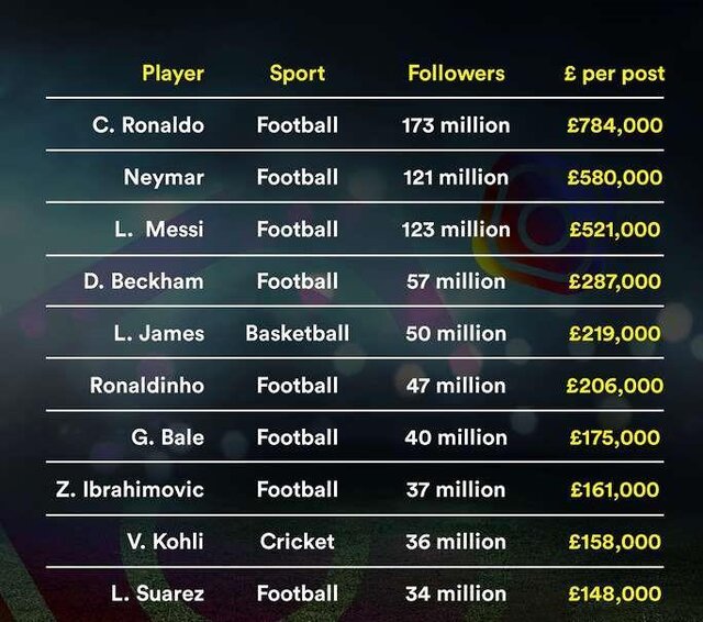 فوتبالیست های سرشناس با پست های که می گذارند نه تنها هواداران خود را از وضعیت و افتخارات خود در جریان می گذارند بلکه درآمدهای نجومی هم کسب می کنند و طبق انتظار کریستیانو رونالدو با توجه به محبوبیت زیاد و تعداد فالورهای که دارد بیشترین درآمد را دارد.
