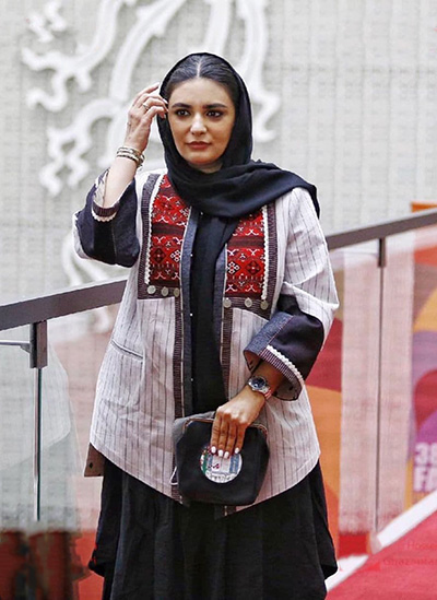 روزنو :خانم کیانی در این جشنواره مانتو نواردوزی و سوزن دوزی شده، با برش مورب در جلوی مانتو و جیب‌های فیلتابی، برتن داشتند.
