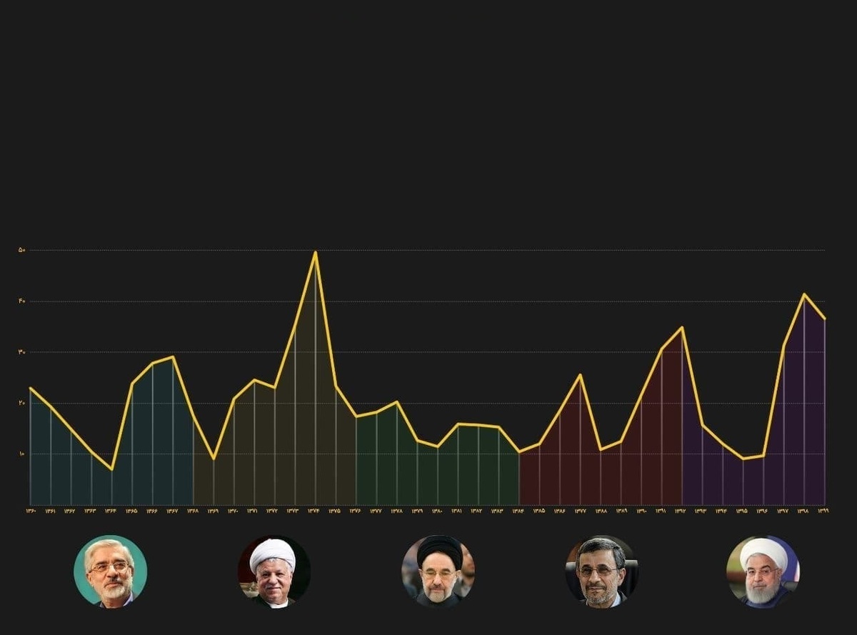 روزنو :در این بررسی، نرخ تورم سالانه در هر یک از دولت‌های ۸ ساله میرحسین موسوی، هاشمی‌رفسنجانی، محمد خاتمی، محمود احمدی‌نژاد و حسن روحانی، بدون توجه به شرایط خاص سیاسی و اجتماعی هر دوران و صرفاً از نظر کمی با هم مقایسه می‌شوند.