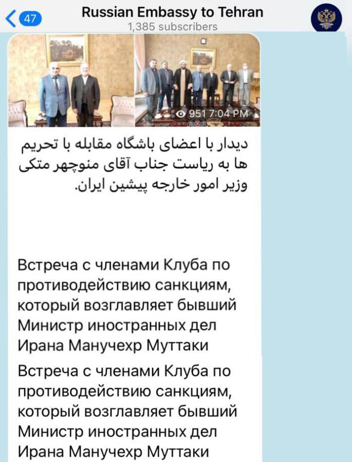 تا اینکه کانال رسمی سفارت روسیه در تهران خبر از ملاقات آقای سفیر با تیم شورای راهبردی باشگاه تحریمی ها داد که به دیدار منوچهر متکی رفته بود.