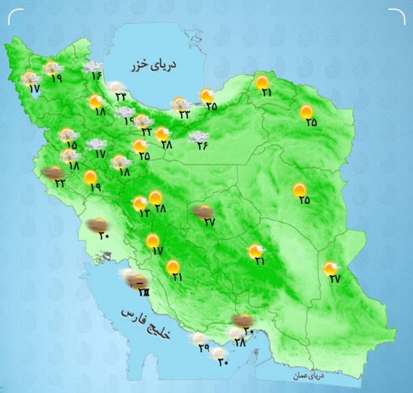 بر اساس اعلام سازمان هواشناسی کشور، امروز در ساعات بعد از ظهر و اوایل شب، در مناطقی از کرمان، نیمه جنوبی سیستان و بلوچستان، شمال و شرق هرمزگان و برخی نقاط واقع در سمنان، یزد، اصفهان، مرکزی، قم، تهران، البرز، قزوین، زنجان، اردبیل، مشال استان‌های آذربایجان شرقی و آذربایجان غربی و ارتفاعات البرز مرکزی رگبار پراکنده گاهی رعد و برق، وزش باد شدید موقت و در مناطق مستعد گرد و خاک پیش‌بینی می‌شود.