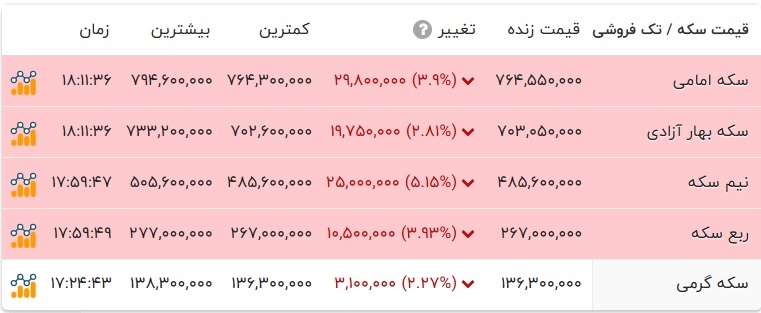 در بازار نرخ هر گرم طلای ۱۸ عیار با ۲۱۸ هزار تومان کاهش و با نرخ ۶ میلیون و ۶۵۲ هزار تومان در بازار طلا معامله شد. سکه امامی با ۲ میلیون و ۹۸۰ هزار تومان کاهش به ۷۶ میلیون و ۴۵۵ هزار تومان قیمت گذاری شد. سکه بهار آزادی با ۱ میلیون و ۹۷۵ هزار تومان کاهش به ۷۰ میلیون و ۳۰۵ هزار تومان رسید. نرخ نیم سکه و ربع سکه به ترتیب ۴۸ میلیون و ۵۶۰ هزار تومان و ۲۶ میلیون و ۷۰۰ هزار تومان در تابلو اعلان قیمتها نمایان شد.