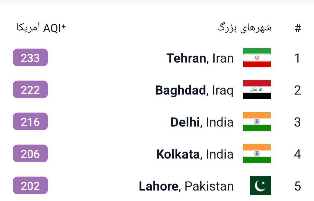 به گزارش تابناک، براساس اطلاعات شرکت سوئیسی IQAir، تهران درحال‌حاضر آلوده‌ترین شهر جهان محسوب می‌شود. طبق گزارش این شرکت، تهران با شاخص ۲۳۳، صدر جدول آلودگی هوا را در سرتاسر جهان از آن خود کرده است. رتبه دوم، به شهر بغداد در عراق اختصاص دارد.