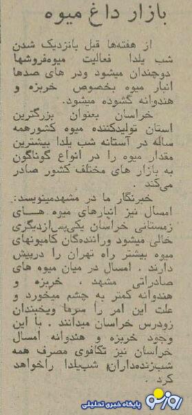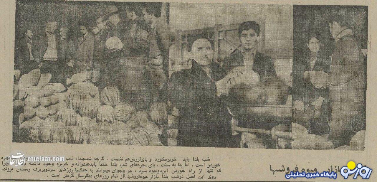 به گزارش روز نو نیم قرن پیش در هفته آخر آذر بازار میوه و گل فروشی در تهران روز‌های پر جنب و جوشی را تجربه می‌کرد. روزنامه اطلاعات ۲۹ آذر ۱۳۵۴ گزارش‌های مصوری از این بازار‌ها منتشر کرد. گزارش‌ها را بخوانید و عکس‌ها را تماشا کنید.