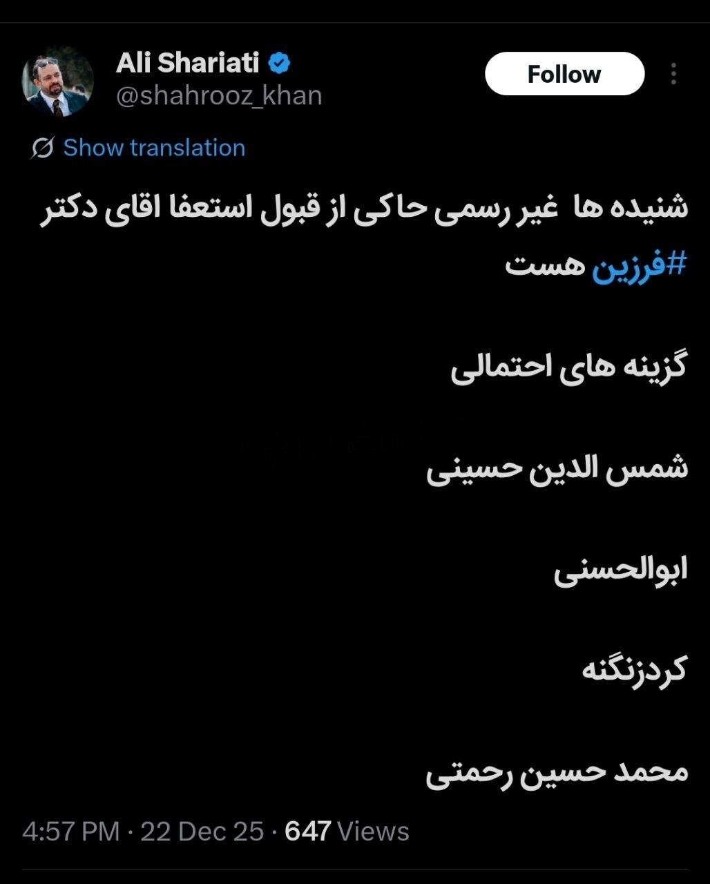 علی شریعتی، فعال اقتصادی و عضو اتاق بازرگانی که در سال گذشته از احتمال بسیار زیاد برای تغییر فرزین خبر داده بود، امروز نیز در فضای مجازی نوشته است که «شنیده‌های غیررسمی حاکی از قبول استعفای فرزین است.» شریعتی در ادامه از گزینه‌های احتمالی یعنی شمس‌الدین حسینی، ابوالحسنی، کردزنگنه و محمدحسینی رحمتی نیز نام برده است.