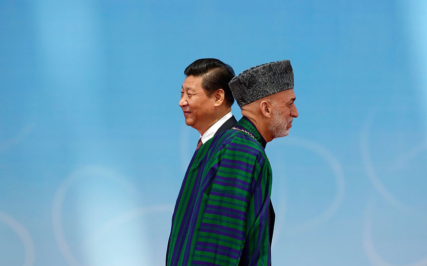 روزنو :حامد کرزای رییس جمهور افغانستان در حال عبور از کنار شی جن پنگ رییس جمهور چین در اجلاس سران آسیا (سیکا) در شانگهای چین.